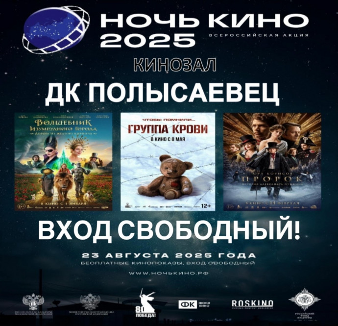 23 августа 2025 года — "Ночь кино" в ДК "Полысаевец"!Вот уже десятый год подряд Кузбасс присоединяется к масштабной всероссийской акции "Ночь кино", которая объединяет любителей кино со всей страны. В этот вечер кинозалы, концертные залы, музеи и библиотеки станут площадками для бесплатных показов лучших современных фильмов. ДК "Полысаевец" (ул. Токарева, 6а) также станет частью этой дружелюбной традиции! Мы приглашаем всех желающих на увлекательную программу, где можно будет бесплатно посмотреть яркие новинки российского кинематографа. Программа кинопоказов в ДК "Полысаевец":