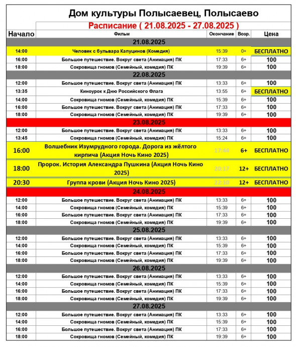 А 23 августа 2025 года вас ждет "Ночь кино" в ДК "Полысаевец"! Вот уже десятый год подряд Кузбасс присоединяется к масштабной всероссийской акции "Ночь кино", которая объединяет любителей кино со всей страны. В этот вечер кинозалы, концертные залы, музеи и библиотеки станут площадками для бесплатных показов лучших современных фильмов. ДК "Полысаевец" (ул. Токарева, 6а) также станет частью этой дружелюбной традиции! Мы приглашаем всех желающих на увлекательную программу, где можно будет бесплатно посмотреть яркие новинки российского кинематографа. Программа кинопоказов в ДК "Полысаевец":«Волшебник Изумрудного города. Дорога из жёлтого кирпича» (6+) время показа с 16:00-17:44. Режиссёр: Игорь Волошин. Лидер прошлогоднего кинопроката — красочный мультфильм о приключениях Дороти и её друзей в волшебном мире. Захватывающая история для всей семьи!«Пророк. История Александра Пушкина» (12+) время показа с 18:00-20:17. Режиссёр: Феликс Умаров. Яркое воплощение национального наследия России. Фильм рассказывает о жизни и творчестве великого поэта, погружая зрителя в атмосферу XIX века.«Группа крови» (12+) время показа с 20:30-22:10. Режиссёр: Максим Бриус. Фильм посвящён 80-летию Победы в Великой Отечественной войне. Это история о мужестве, преданности и героизме, которые стали символом нашей истории.Дата: 23 августа 2025 года Время: Начало с 16:00 Билеты: Вход свободный! Место: Кинозал ДК "Полысаевец", ул. Токарева, 6а Бесплатный вход для всех возрастов.Уникальная возможность: Посмотреть самые кассовые и интересные фильмы текущего года совершенно бесплатно! Телефон справочной службы: 8 (38456) 2-99-80 #Полысаево #Кино #ДКПолысаевец #Мультфильмы #СемейныйДосуг