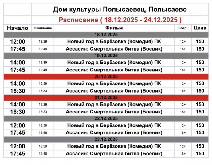 Репертуар кинозала ДК «Полысаевец»18–24 декабря